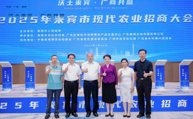 为贯彻落实习近平总书记关于广西工作的重要论述,深入推进与粤港澳大湾区的农业产业对接,助力来宾市现代农业产业迈向高质量发展新征程,2025年7月24日上午,来宾市人民政府在广州市举办2025年来宾市现代农业招商大会。本次活动由来宾市人民政府主办,来宾市农业农村局、广东区域协作消费帮扶产品交易中心、广东泰润文化传媒有限公司承办,中国县域博览会组委会、广东省老区建设促进会、广州市协作办公室、广东省乡村振兴促进会提供支持,来宾市领导、市农业农村局等相关单位、县市区分管领导、部门负责人、特邀企业代表以及大湾区企业代表、商协会代表、特邀嘉宾等100多人共襄盛举,活动取得圆满成功。
