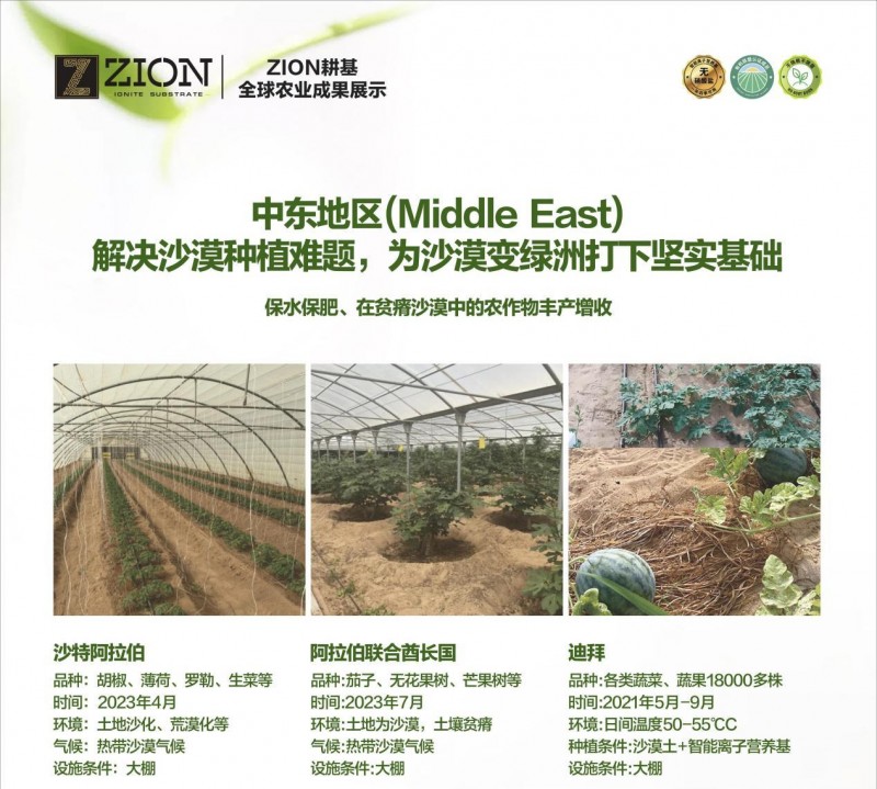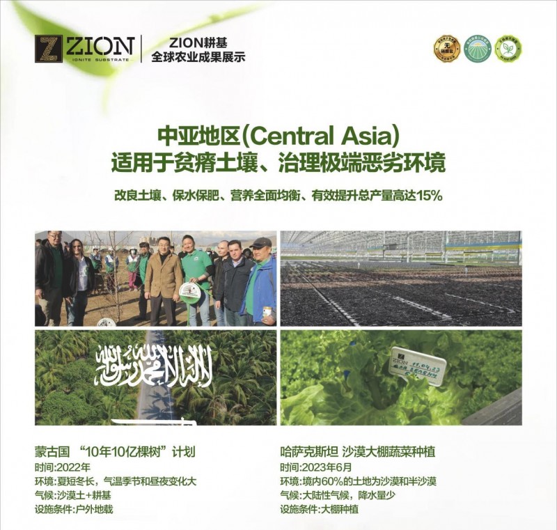 如2020年,ZION曜土与蒙古国达成国家战略合作,参与蒙古国“10年10亿棵树”计划。蒙古国气候干燥,土质沙化严重,ZION智能离子营养基改良土壤,保水保肥,营养均衡全面,使用一次效力长达两年等优势,有效缓解环境持续恶化,改善居民生活环境!哈萨克斯坦因降水量少,大部分地区不利于农作物的耕种,采用ZION智能离子营养基在大棚种植生菜,总产量有效提高15%,大幅提升大棚种植产量,助力哈萨克斯坦标准大棚农业生产。同时,ZION耕基作为沙特国家战略“绿色沙特2030”重要合作伙伴之一,陆续参与了多种农业植物的种植和推广,包括胡椒、薄荷、罗勒、生菜、辣椒、番茄、黄瓜、草莓、枣椰树等,让农作物得以在沙漠地区茂盛生长,变不可能为可能!