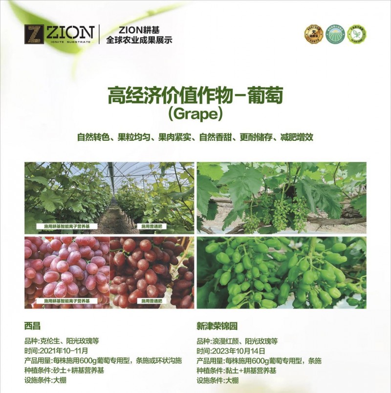 紧跟国家乡村振兴战略,2021年起,ZION曜土在西昌设立凉山州总代理,聚焦高经济价值作物等农产品提质增效、土壤改良及效率提升!2023年,依托ZION耕基中国总部所在地,新津区首个葡萄种植示范基地授牌落成,在俄罗斯专家团队的技术支持下,打造集产、学、研多功能于一体的国家级葡萄新品种新技术示范基地!使用ZION耕基营养基种植葡萄品种包含妮娜皇后、阳光玫瑰、克伦生、浪漫红颜等品种,形成了上千亩的规模化种植,取得了优异成果,省工省时,提质增效,植株长势更优更健康、并大幅提升果品质量,同时也有效改良了种植土壤,实现了绿色、高产、优质的跨越式提升。