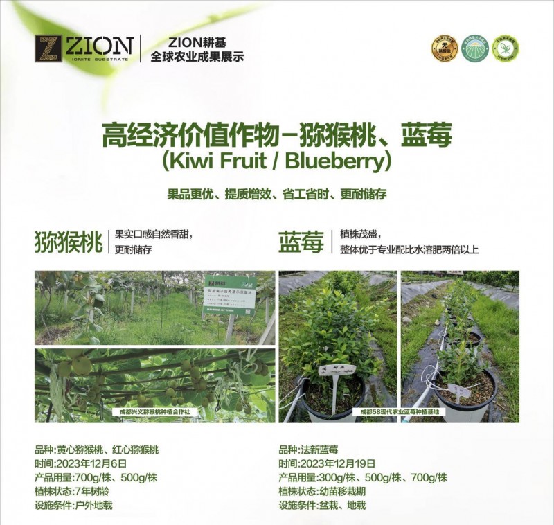 ZI0N耕基与58农业中国总部达成合作,对法新蓝莓进行对比种植。在蓝莓幼苗移栽期使用营养基,成果证明,蓝莓主茎粗度明显粗于配比水溶肥,基生枝条数和侧枝数也多于配比水溶肥,植株茂盛,叶色浓绿有光泽、果实颗粒均匀饱满,口感更佳。新津兴义猕猴桃种植合作社使用耕基智能离子营养基种植的猕猴桃,经过整个生长周期的试种证明,经测量果实果径优于其它肥料,口感更自然香甜,更耐储存,为猕猴桃种植的提质增产提供了良好示范。
