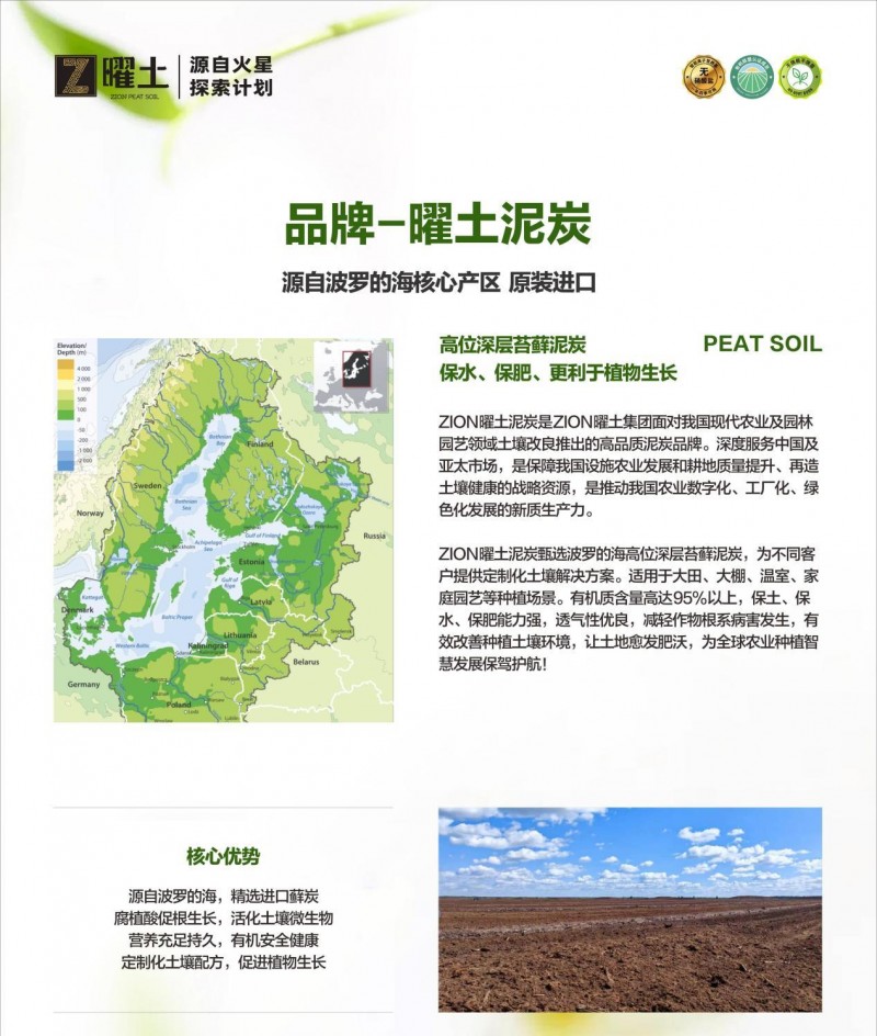ZION曜土泥炭甄选波罗的海高位深层苔藓泥炭,为不同客户提供定制化土壤解决方案。适用于大田、大棚、温室、家庭园艺等种植场景。有机质含量高达95%以上,保土、保水、保肥能力强,透气性优良,减轻作物根系病害发生,有效改善种植土壤环境,让土地愈发肥沃,为全球农业种植智慧发展保驾护航!