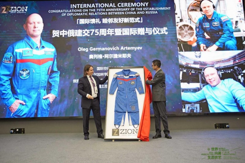 为即将迎来的中华人民共和国75周年华诞、也是中国俄罗斯建交75周年的特别日子里,ZION曜土资深董事&国际空间站航天员奥列格先生将2021年国际空间站中执行任务时所穿的舱内航天服,赠与ZION曜土中国永久收藏。曜土中国项目的落地也是75周年双方在农业和航天领域合作的典型代表,为了纪念这特别具有纪念意义的时刻和中国工厂新一代产品的成功投产,曜土中国工厂专门生产了 75周年国庆纪念版、以及航天员特别版的纪念款。ZION曜土控股CEO Igor Melnikov博士,将代表俄罗斯国家宇航局以及ZION曜土控股总部的,凝聚着两国人民和团队友谊和合作奋斗的75周年国庆纪念版、以及航天员特别版的001号产品赠与ZION中国驻地政府成都市新津区副区长李宁坤先生。“海内存知己,天涯若比邻”,中俄友谊历久弥新,此时此刻,让我们一起恭贺中华人民共和国成立75周年华诞、纪念中俄建交75周年,共同见证国际睦邻友好新范式!