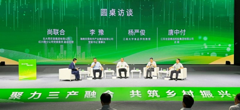 在圆桌访谈环节,江南大学食品学院教授杨严俊、海南农垦热作产业集团有限公司党委书记董事长李豫、北大荒农垦集团有限公司红兴隆分公司党委委员副总经理尚联合以及龙垦臻选控股集团有限公司总裁唐中付等四位嘉宾围坐在一起,共同探讨三产融合赋能乡村振兴的多元路径。